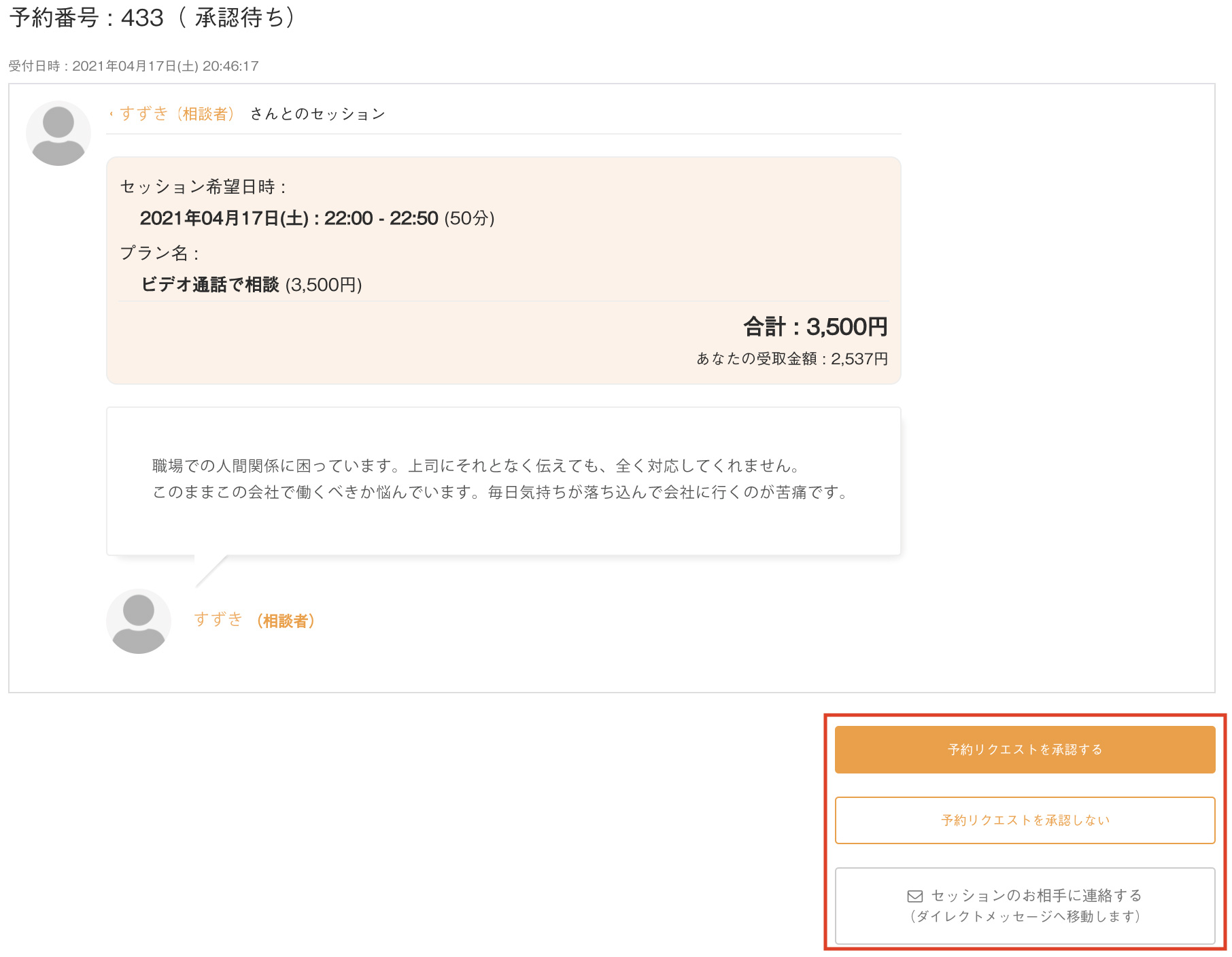 日時が合わない場合や、相談概要をもう少し確認したい場合は、「セッションのお相手に連絡する」をクリックし、ダイレクトメールを通じて、相談者と相談してください。