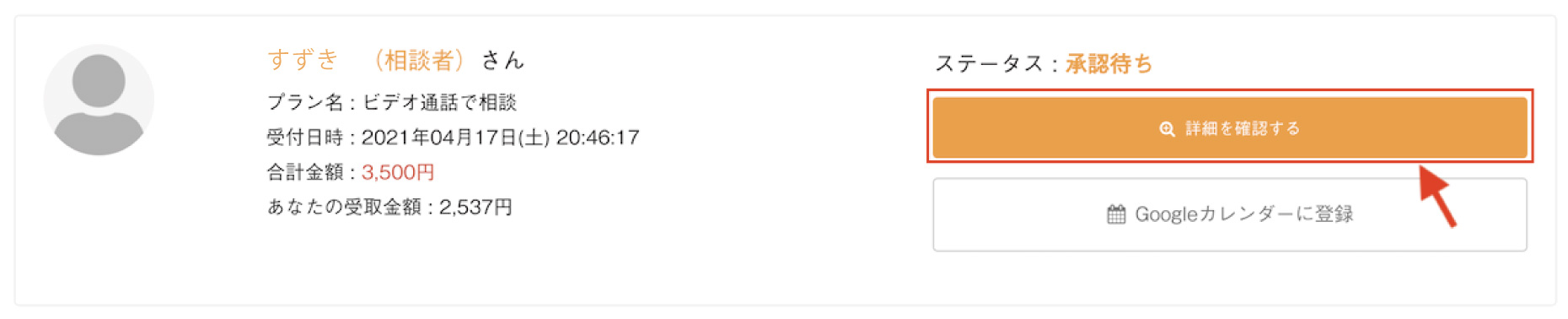 他のユーザーから予約リクエストが届くと、 マイページ > 予約&出金管理 > 承認が必要な予約リクエスト に表示された一覧で、「詳細を確認する」をクリックしてください。